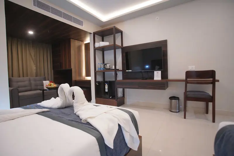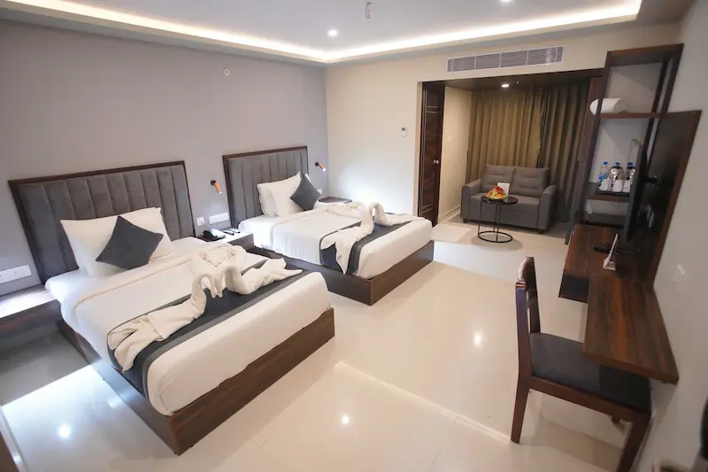 Bloft Hotel in Vellore offers family rooms with air-conditioning, private bathrooms, and modern amenities. Each room includes a work desk, sofa bed, and free WiFi.